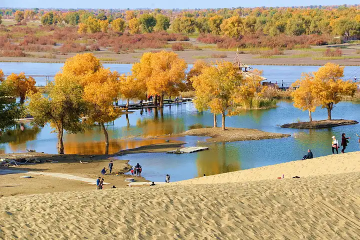 上午抵达库尔勒,乘车赴塔克拉玛干沙漠边的罗布人村寨。村寨方圆 72 平方公里,是一处罗布人居住的世外桃源,寨区涵盖塔克拉玛干沙漠、游移湖泊、塔里木河、原始胡杨林、草原和罗布人。我们乘坐景区的观光车深入村寨,首先看到的是大片的塔里木河畔的胡杨,虽然此时不是胡杨金黄的季节,但那挺拔的枝干依然展现出顽强的生命力。接着来到浩淼无边的塔克拉玛干沙漠,这里可以骑骆驼(个人娱乐项目,费用自理),我们几人决定体验一下,骑在骆驼背上,感受着沙漠的广袤与寂静,拍摄下生动的沙漠驼影和壮观的沙漠落日。