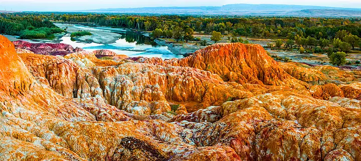 下午,前往五彩滩,这里的雅丹地貌在夕阳的照射下呈现出五彩斑斓的颜色。沟涯起伏,层层叠叠的岩石在阳光的勾勒下,形成了各种奇特的形状,仿佛是大自然的艺术杰作。站在观景台上,看着太阳渐渐西沉,余晖洒在五彩滩上,整个大地都被染成了金色,与远处的额尔齐斯河交相辉映,构成了一幅壮丽的画面。