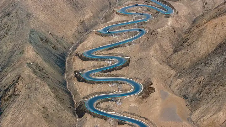 早餐后,我们乘车前往游览盘龙古道。当地叫瓦恰公路,全部盘山公路超过 600 个弯道全长 75 公里,海拔约 4100 米左右,黑色公路与土色山体的完美融合,加上远处连绵的雪山,这只属于帕米尔高原。我们在这里留下了珍贵的照片,感受着 “走过人生所有的弯路
